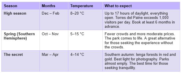 In summer (December–February), temperatures range between 8 and 20 °C. In the shoulder seasons, they range between 4 and 15 °C. The determining factor is not the cold—it’s the wind, which can change the perceived temperature in minutes and exceed 100 km/h in Torres del Paine.