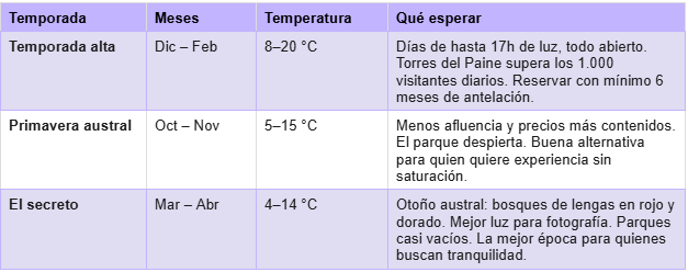 En verano (diciembre–febrero), entre 8 y 20 °C. En los meses de temporada intermedia, entre 4 y 15 °C. El factor determinante no es el frío: es el viento, que puede cambiar la sensación térmica en minutos y superar los 100 km/h en Torres del Paine.